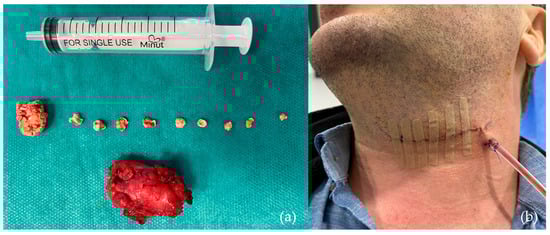 Figure 6. One of the cases requiring submandibulectomy involved a patient with 10 calculi: (a) Submandibular gland and sialoliths following submandibulectomy; (b) clinical aspect 48 h post-submandibulectomy.