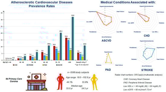 Studies show different estimates of ASCVDs’ prevalence rates because they differ in the types of sampling in populations with different age ranges. According to NHANES data from 2017 to 2020, among United States (US) adults ≥ 20 years of age, the prevalence of CHD and stroke was 7.1% and 3.3%, respectively [40]. PAD’s prevalence has continued to increase in recent years, likely due to the ageing population. The 2019 Global Burden of Disease Study showed that the global prevalence of PAD in people aged 40 years and older was 1.5% (1.0% in men and 2.0% in women). PAD is uncommon in those younger than 40 years of age, affecting one in ten people aged 70 years and one in six people aged 80 years and older [41]. The prevalence of PAD in the US among individuals ≥ 40 years of age reached 10.7% between 2003 and 2008, according to a report from the American Heart Association (AHA) [42]. Age is associated with CKM disorders, typically including DM, ASCVD, and CKD [43]. Our data showed that ASCVD events were rare in people younger than 40 years, and ASCVD’s prevalence was very similar to the AHA report [42] in people aged 40 years and older. The ASCVD prevalence rates increased precisely with age according to simple second-degree polynomial functions, and they were higher in men than in women from age 40 years for CHD and ASCVD, from age 50 to 69 years for stroke, and from age 60 years for PAD. Some authors report that cardiovascular events in women usually occur about five to ten years later than in men [44,45]. On the other hand, our results also showed a higher mean age among women with ASCVD than among men, although the difference did not exceed five years (74.9 and 70.2 years, respectively).