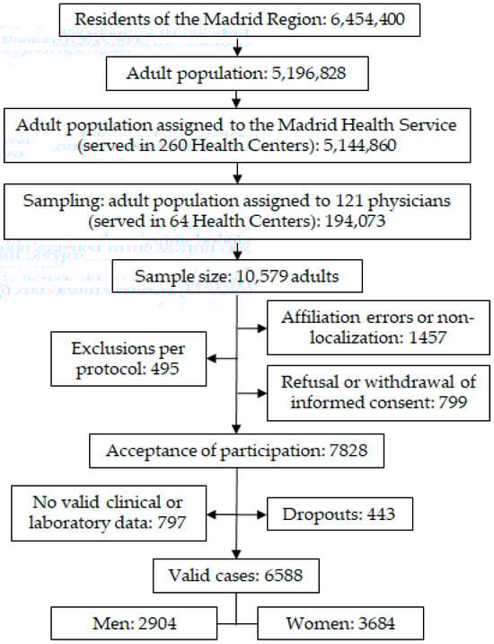 The observational, cross-sectional, multicentre SIMETAP study was authorised by the Madrid Health Service (SERMAS, according to its acronym in Spanish), whose design was previously published in [13]. The flowchart for the sampling and enrolling of study subjects is shown in Figure 2. Healthcare for 99% of the adult population (5,144,860 people) from the Madrid Region (Spain) was provided in 260 SERMAS healthcare centres. This population was identified using the SERMAS database, which contains the numerical digits of each individual’s Health Identity Card (HIC). A simple random sample was performed using the “randbetween” function of the Microsoft Excel application among all people aged 18 or older assigned to 121 research physicians from 64 SERMAS health centres and identified by their respective HICs (194,073 adults). The sample size for this finite population was calculated considering p = 0.5 for the expected proportion, 25% for non-response, and 14% for losses and dropouts, with a confidence level of 95% (α error), and 2.4% for the confidence interval. The physicians conducted interviews with the participants and collected data from their electronic medical records in a real-world primary care setting.