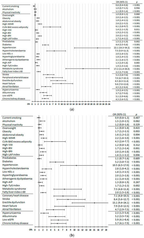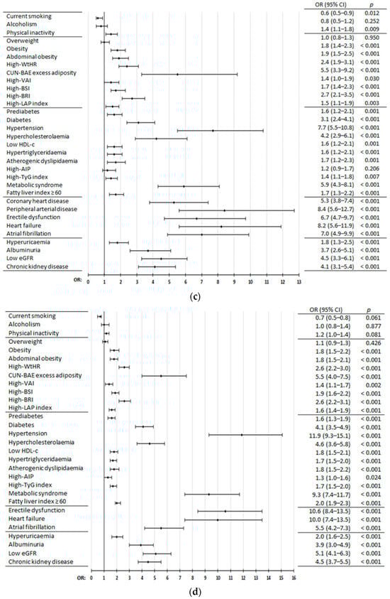 The clinical conditions related to excess or dysfunctional adiposity that showed association with ASCVDs were obesity [19], abdominal obesity [11], and high values of the waist-to-height ratio (WtHR) [20], CUN-BAE (according to its acronym in Spanish, Clínica Universitaria de Navarra—Body Adiposity Estimator) [21,22], visceral adiposity index (VAI) [23,24], body shape index (BSI) [22,25], body roundness index (BRI) [22,26], and lipid accumulation product (LAP) index [24,27], highlighting CUN-BAE excess adiposity (OR: 4.3 to 6.1) (Figure 3a–d, Tables S6–S9 [Supplementary Materials]). DM [28], HTN [29], hypercholesterolaemia [30], low HDL-c [30], HTG [30], atherogenic dyslipidaemia, high triglyceride–glucose (TyG) index [24,31], MetS [11], fatty liver index (FLI) ≥ 60 [32], and hyperuricaemia [33] showed associations with ASCVDs, highlighting DM (OR: 3.1 to 5.2), hypercholesterolaemia (OR: 2.8 to 7.5), and especially MetS (OR: 5.9 to 17.1) and HTN (OR: 7.7 to 22.1). Prediabetes [28] was associated with CHD, stroke, and ASCVD, but not with PAD. High atherogenic index of plasma (AIP) [34] was associated only with ASCVD (Figure 3a–d, Tables S7–S10 [Supplementary Materials]). Albuminuria (urine albumin–creatinine ratio ≥ 30 mg/g), low eGFR (< 60 mL/min/1.72 m2), and CKD [35] were strongly associated with CHD, stroke, PAD, and ASCVD, highlighting low eGFR (OR: 4.5 to 5.9) (Figure 3a–d, Tables S6–S9 [Supplementary Materials]).