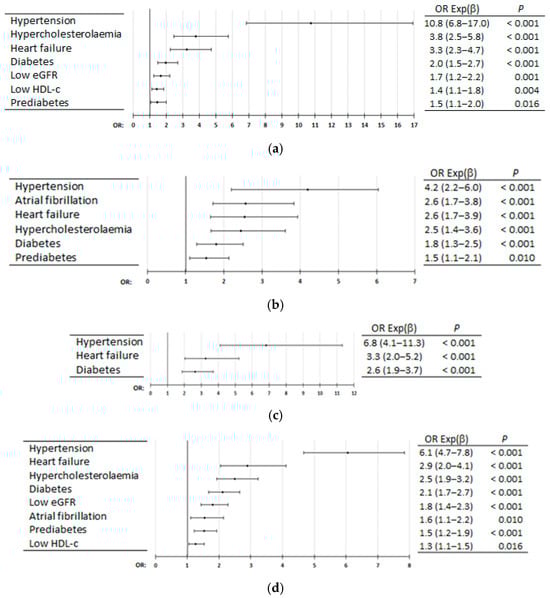 Multivariate analysis of diseases and medical conditions for coronary heart disease (a), stroke (b), peripheral arterial disease (c), and atherosclerotic cardiovascular disease (d). OR Exp (β): odds ratio (95% confidence interval); p: p-value of Wald test with one degree of freedom; eGFR: estimated glomerular filtration rate; HDL-c: high-density lipoprotein cholesterol.