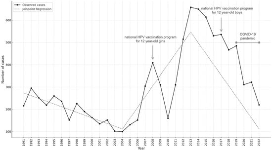 Number of anogenital warts by calendar year among the attendees of the STI/HIV centre of the San Gallicano Dermatological Institute (IRCCS; Rome, Italy) from 1991 to 2022; the fitted curve resulting from the joinpoint analysis is shown; years of implementation of free HPV vaccination for adolescent girls and boys are indicated, along with the COVID-19 pandemic years.