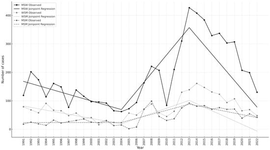 Number of anogenital warts by calendar year in women who have sex with men (WSM), men who have sex with women (MSW), and men who have sex with men (MSM) from 1991 to 2022; the fitted curves resulting from the joinpoint analysis are also shown.