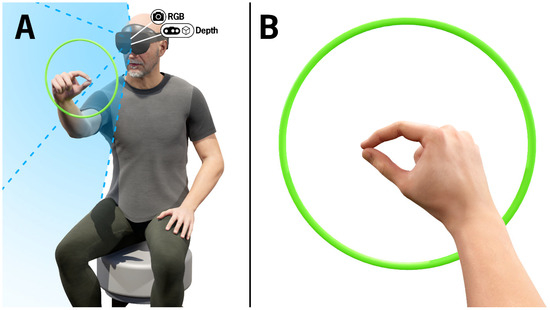 (A) Visualization of a participant completing the finger-tapping test. The green ring represents recognition of the hand in view of the HL2 RGB and depth cameras and is only visible to the wearer of the HL2. The blue shaded region depicts the cameras’ field of view. The camera icons indicate the position of the RGB and depth cameras embedded in the HL2. (B) Visualization of the finger-tapping test from the perspective of the participant wearing the HL2.