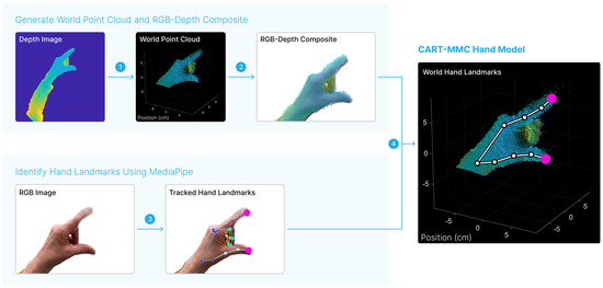 For the MediaPipe hand landmark positions, the nearest projected RGB image points in the RGB-depth composite were identified. The corresponding world points defined the CART-MMC hand model (“World Hand Landmarks”, Figure 2).