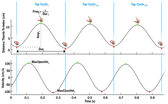 Kinematic metrics were calculated for the left and right hands separately. Local minima detection was performed using the findpeaks MATLAB function on the Distance-Thumb-To-Index with a minimum peak prominence of 0.5 cm, and a minimum peak separation of 0.15 s. Two consecutive minima defined one TapCycle. For each TapCycle, duration (Dur), frequency (Freq), and amplitude (Amp) were calculated. Amp (cm) was defined as the difference between the max open position and the initial close position. Dur (s) is the temporal difference between the final close position and the initial close position. Freq (Hz) is the inverse of Dur. MaxOpenVel and MaxCloseVel are the local maximum and minimum velocities per cycle, respectively (Figure 3).