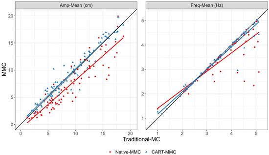 Scatterplots and linear fit lines for Amp-Mean and Freq-Mean for each trial, comparing the Traditional-MC against the Native-MMC (red dots and red line) and the CART-MMC (blue triangles and blue line). The black reference lines represent perfect equivalence with the Traditional-MC. Left plot: The Native-MMC consistently underestimated Amp-Mean, by 19.5% on average, depicted by the red line below the equivalence line. The CART-MMC measured Amp-Mean within 1.7% on average, indicated by the blue line’s close alignment to the equivalence line. Right plot: The Native-MMC’s Freq-Mean showed poor accuracy above 3 Hz, represented by the red line skewing away from the equivalence line. The CART-MMC accurately quantified Freq-Mean across the range of frequencies measured, demonstrated by the close alignment of the blue line with the equivalence line.