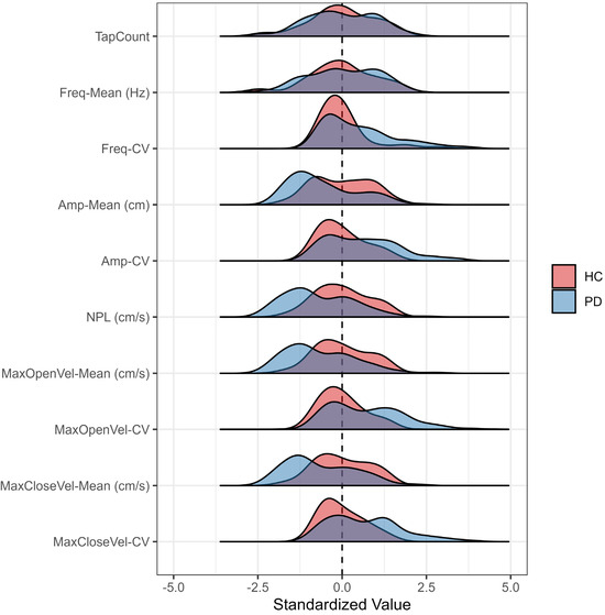 TapCount is the total number of tap cycles completed. Mean and coefficients of variation (CV) were calculated for Amp, Freq, MaxOpenVel, and MaxCloseVel (Amp-Mean, Amp-CV, Freq-Mean, Freq-CV, MaxOpenVel-Mean, MaxOpenVel-CV, MaxCloseVel-Mean, MaxCloseVel-CV). Normalized path length (NPL) is the sum of the absolute value of the 3D difference between consecutive distances divided by total trial duration, characterizing both movement amplitude and velocity.
