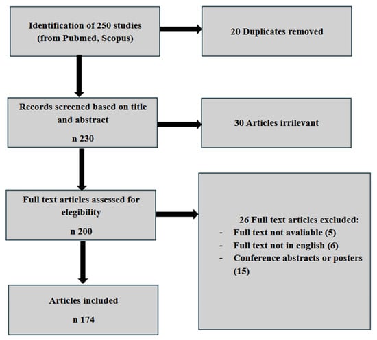 A total of 250 studies were initially identified through PubMed and Scopus. After excluding 20 duplicate records, 230 articles were screened based on their titles and abstracts, resulting in the removal of 30 irrelevant studies. Of the 200 articles deemed initially eligible for inclusion, 26 were excluded for the following reasons: full text was unavailable for 5 studies, 6 articles were not published in English, and 15 were conference abstracts or posters. As a result, 174 articles were ultimately included in the preparation of this review.