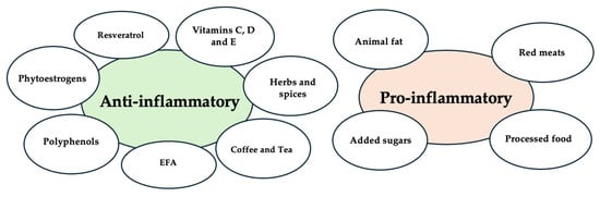 Figure 2 highlights the primary dietary components examined, categorized according to their anti-inflammatory or pro-inflammatory properties.