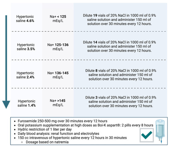 Our working group developed a document on the dosing of hypertonic saline based on natremia, indicating a different dilution of 20% saline ampoules in 0.9% saline, as shown in Figure 3 [16]. After dilution, the dosage is as follows: 150 mL of the dilution along with high-dose furosemide (250–500 mg) administered via an intravenous infusion pump over 30–60 min every 12 h. Furthermore, hypertonic saline administration requires high-dose potassium supplementation and close analytical monitoring to watch for ionic imbalances.