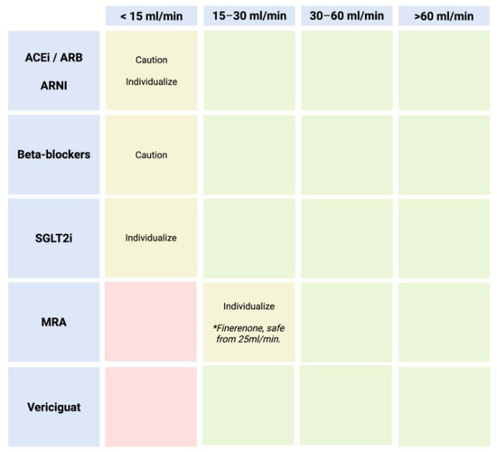 However, sometimes there are limited data to support recommendations on the treatment of patients with HF and severe CKD, as clinical trials to date have excluded patients with advanced-stage CKD. Regarding ACEi and ARBs, their prescribing information allows for their use down to an eGFR of <15 mL/min/1.73 m2, even though there are studies that support their use during dialysis due to their antiproteinuric effect [20]. Recently, the use of ARNIs in HF patients undergoing hemodialysis has also been studied, showing improvements in LVEF and reduced mortality [18]. It is important to note that, in pivotal trials, the cutoff values for patient inclusion were 25 mL/min/1.73 m2 in the DAPA-CKD study [19], 20 mL/min/1.73 m2 in EMPEROR-Reduced [21] and GALACTIC-HF [22], and 15 mL/min/1.73 m2 in the VICTORIA study [23]. In HFrEF patients who develop renal insufficiency due to cardiorenal syndrome, the decision to discontinue disease-modifying drugs should be individualized. The first step should be to assess the cause of renal function decline, considering the following: low cardiac output, the hemodynamic effects of medications (such as reduced renal perfusion due to efferent vasodilation induced by ACEIs, ARBs, or ARNIs), and reversible causes of renal failure, such as hypovolemia, hypotension, or nephrotoxicity from other substances.
