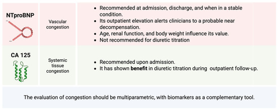 On the other hand, CA 125 has emerged as a key marker of tissue congestion and inflammation in HF [40]. However, for its correct interpretation, it is essential to consider its long half-life: 7–12 days. It is a biomarker primarily associated with systemic congestion and, therefore, with a predominance in the semiology of right-sided HF and an increased risk of adverse clinical events. Its measurement upon admission is useful in the multiparametric evaluation of congestion and establishing an appropriate phenotyping of it. One of its most attractive properties is its potential to monitor clinical course after HF decompensation and pharmacological titration.
