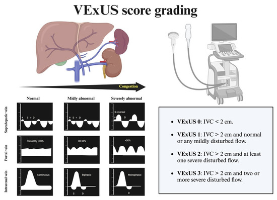 The VExUS assessment aims to assess and grade the organ impairment associated with congestion [49]. This assessment begins with the examination of the IVC in its longitudinal axis, 2 cm from its entry into the right atrium. If the diameter is <2 cm and/or the collapsibility is >50%, vascular congestion is ruled out. If the diameter is >2 cm, further evaluation of the rest of the venous system is necessary. This grading system is especially useful for identifying IVC dilatations due to non-congestive causes.