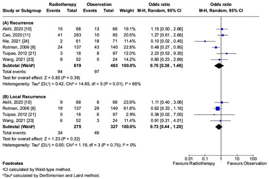 Recurrence forest plot: (A) recurrence [8,10,11,21,23,24]; (B) local recurrence [8,10,21,23].