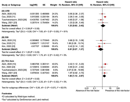 TS ≥ 4 cm, LVSI, and DSI were evaluated as prognostic risk factors for recurrence (Figure 4). LVSI (HR 1.23; 95% CI 0.62–2.42; p = 0.055; I2 = 61%) and DSI (HR 0.61; 95% CI 0.27–1.37; p = 0.23; I2 = 0%) showed no statistically significant difference between the presence or absence of the risk factors. However, TS ≥ 4 cm was an independent negative prognostic risk factor for recurrence (HR 1.83; 95% CI 1.12–2.97; p = 0.02; I2 = 0%). The analysis of combined risk factors was not conducted because of insufficient studies providing these data, preventing a comprehensive analysis of the interactions between risk factors.
