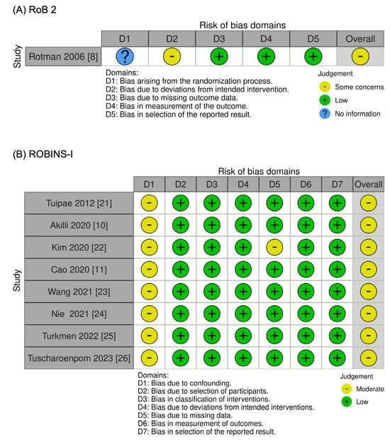 Cochrane Risk of Bias tool: (A) RoB 2 [8]; (B) ROBINS-I [10,11,21,22,23,24,25,26].