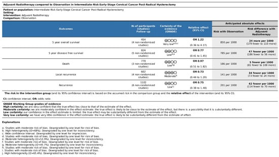 - Silva, P.H.; Molino, G.; Pereira, A.G.; Pimenta, N.; Dias, M.; Cavalcante, D.; Santos, A.C.; Ferreira, S.; Santos, R.; Reis, A. Adjuvant Radiotherapy in Intermediate-Risk Early-Stage Cervical Cancer Post-Radical Hysterectomy: A Systematic Review and Meta-Analysis [PROSPERO Registration]. International Prospective Register of Systematic Reviews. CRD42024587124. 2024. Available online: https://www.crd.york.ac.uk/prospero/display_record.php?ID=CRD42024587124 (accessed on 20 February 2025).