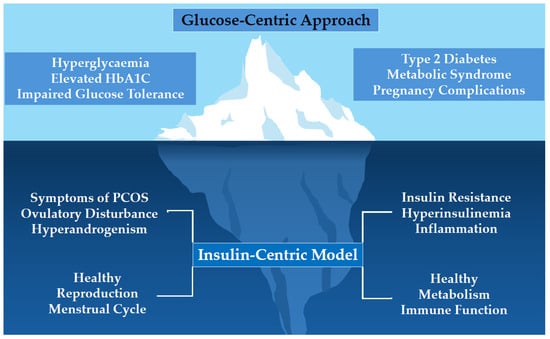 The aim of this paper is to present a review of the current state of research on the advantages and disadvantages of adopting an insulin-centric model of PCOS, compared with the longstanding glucose-centric approach. Section 3, Section 4, Section 5, Section 6 and Section 7 provide the background and rationale for adopting a new approach to early diagnosis and management of metabolic disturbance in women with PCOS. This model emphasizes the central role of hyperinsulinemia and IR as driving forces that shape disease progression.