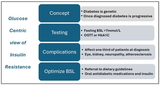 Features of a glucose-centric model of insulin resistance. Abbreviations: BSL = blood sugar levels; mmol/L = millimole per liter; OGTT = oral glucose tolerance test; HbA1C = Hemoglobin A1C.