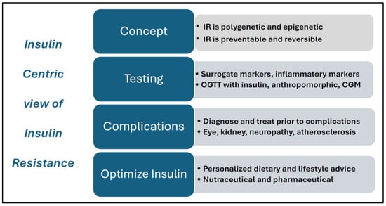 Features of an insulin-centric model of insulin resistance. Abbreviations: IR = insulin resistance; OGTT = oral glucose tolerance test; CGM = continuous glucose monitoring.
