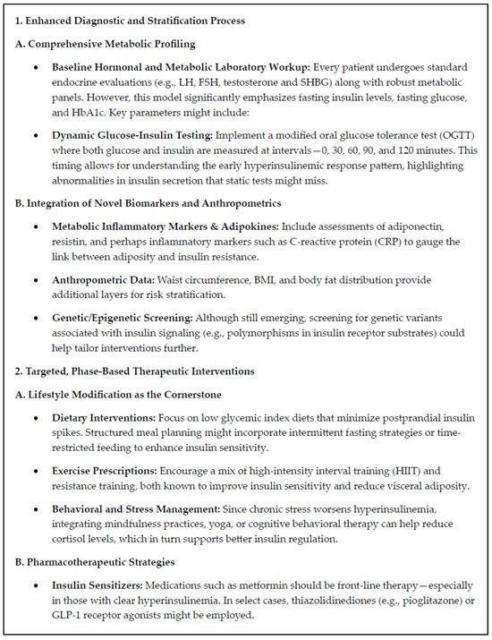 In addition, the outdated assumption that T2DM in PCOS is an inevitable and inherited progressive disease, rather than a largely preventable consequence of untreated IR, has delayed recognition of the underlying metabolic problem and hindered opportunities for early targeted intervention to prevent future chronic diseases. This belief contributes to an emphasis on managing blood glucose rather than addressing the upstream metabolic drivers of IR and hyperinsulinemia. However, nowadays, there is growing evidence that lifestyle modification and early targeted interventions can significantly reduce the risk of disease progression [50]. An insulin-centric strategy allows for earlier detection and more proactive management, potentially preventing both GDM and T2DM [53].