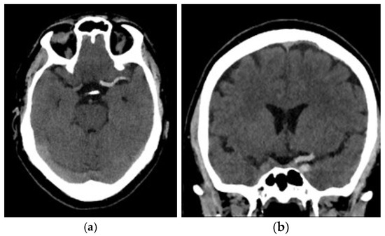 All patients enrolled in the study underwent a NCECT at our public hospital using two different CT scanners (16 rows of detectors, 120 kV) of the same make and model (Phillips Ingenuity; Amsterdam, the Netherlands) during the diagnosis process of AIS. Patients were randomly assigned to each scanner. The acquisition and reconstruction protocols were identical in both scanners. The images obtained had a slice thickness of 0.625 mm. Although reconstructions with a thickness of 1 mm were available, they were not used for analysis. The window width and center were set at 80 and 40 Hounsfield units (HU), respectively (Figure 1).
