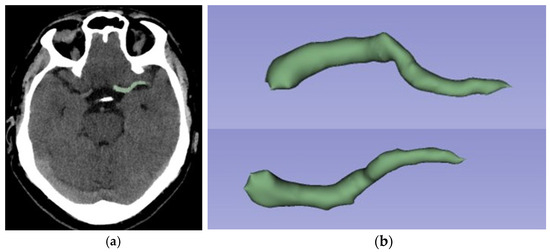 The Digital Imaging and Communications in Medicine (DICOM) files of the brain NCECT were imported into 3D-Slicer version 5.2.2 (free software available at www.slicer.org) [23]. The region of interest (ROI) was defined as the visible thrombus in the ICA and/or proximal MCA (M1 and M2 segments). A 3D-semi-automatic segmentation was performed using the segment editor of 3D-Slicer [24]. The selected segmentation tool is “Level Tracing”, whereby the outline is defined by the movement of the mouse, resulting in pixels that share the same background density value as the mouse’s current background pixel. The subsequent application of the outline to the region of interest is a decision that is made by the radiologist. Segmentation was performed by a radiology resident who had received specialized training. The segmentation was validated by three neuroradiologists with expertise in neurointervention and neuroimaging (Figure 2). The RFs were also extracted in 3D-Slicer using the Radiomics module. For all ROIs, image voxel resampling to a dimension of 1 mm × 1 mm × 1 mm was performed. Smoothing with a Gaussian filter and a fixed gray bin width value of 25 was also performed to normalize the images. Wavelet-based features and kernel sizes of 3, 5 and 7 were also performed [25,26].