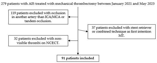 A total of 279 patients with AIS underwent mechanical thrombectomy between January 2021 and May 2023. In 119 patients, the occlusion was in an artery other than the ICA/MCA, or a tandem occlusion. In 37 patients, the initial attempt at mechanical thrombectomy was conducted using the stent retriever or combined technique. In 32 cases, the precise location of the thrombus could not be determined using NCECT. Finally, 91 patients were included in the study (Figure 4).