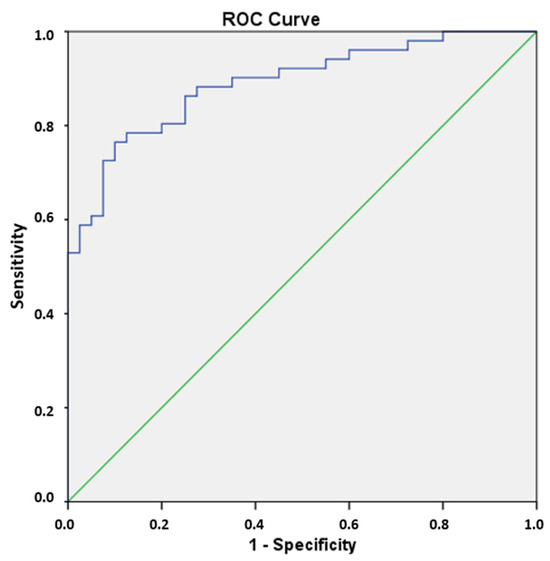 The ROC curve was obtained with SPSS using the six RFs selected in the logistic regression. The green line represents an AUC of 0.5. The blue line shows the AUC obtained in the FPE prediction (0.890).