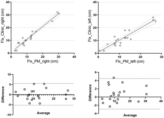 Trunk flexion correlation and Bland–Altman of flexion (difference vs. average) between clinical and photogrammetric methods. Flx_Clinic_right: right side trunk flexion assessment using the clinical method; Flx_Clinic_left: left side trunk flexion assessment using the clinical method; Flx_PM_right: right side trunk flexion assessment using the photogrammetric method; Flx_PM_left: left side trunk flexion assessment using the photogrammetric method.