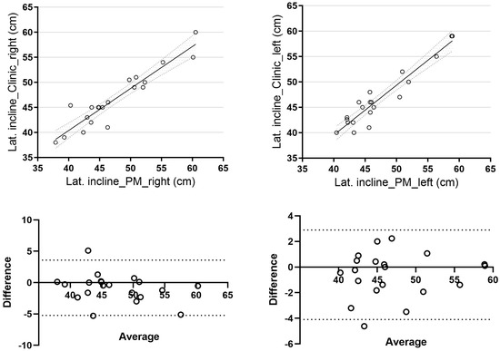 Lateral trunk inclination correlation Bland–Altman of lateral inclination (difference vs. average) between clinical and photogrammetric methods. Lat. incline_Clinic_right: right side trunk inclination assessment using the clinical method; Lat. incline_Clinic_left: left side trunk inclination assessment using the clinical method; Lat. incline_PM_right: right side trunk inclination assessment using the photogrammetric method; Lat. incline_PM_left: left side trunk inclination assessment using the photogrammetric method.