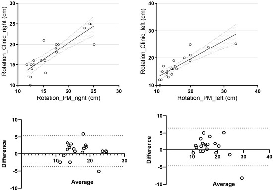 Trunk rotation correlation Bland–Altman of trunk rotation (difference vs. average) between clinical and photogrammetric methods. Rotation_Clinic_right: right side trunk rotation assessment using the clinical method; Rotation_Clinic_left: left side trunk rotation assessment using the clinical method; Rotation_PM_right: right side trunk rotation assessment using the photogrammetric method; Rotation_PM_left: left side trunk rotation assessment using the photogrammetric method.