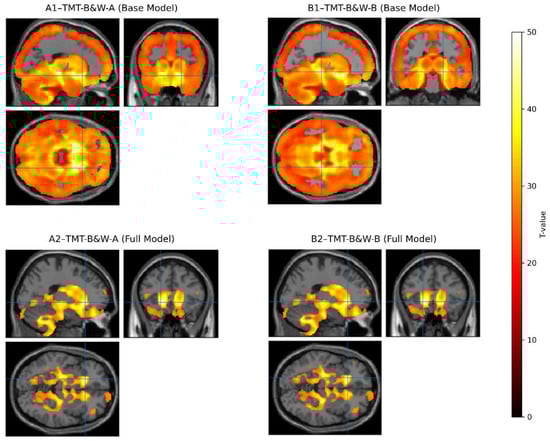 Our observation of thalamic convergence in the fully adjusted models aligns with previous work identifying the thalamus as a subcortical hub for relaying and integrating cortical signals during executive function tasks [,]. These findings suggest that while cortical regions may contribute more prominently in unadjusted models, subcortical structures like the thalamus become more apparent when controlling for key demographic confounders. This is particularly relevant in aging populations, where cortical thinning and educational disparities may mask subcortical contributions in simpler models [,]. Importantly, the predominance of frontal effects in unadjusted models does not imply exclusive involvement of these regions. Prior functional imaging research has highlighted distributed neural networks underpinning TMT performance, including parietal and cerebellar regions []. However, the convergence of both TMT-B&W-A and B on the thalamus in adjusted models suggests shared integrative pathways supporting task execution under demographic control.
