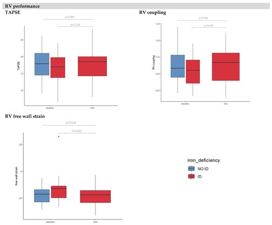 After intravenous iron replacement (Table 3), improvements in GLS (−8.5 ± 9% vs. −9.3 ± 3%), work efficiency (74 ± 10% vs. 79 ± 10%), myocardial work (665 [453–1013] mmHg% vs. 801 [447–1183] mmHg%) and wasted work (290 [228–384] mmHg% vs. 239 [151–302] mmHg%) were observed (all p-values <0.05). Regarding the RV function, patients had an improved RV coupling ratio (0.54 ± 2 vs. 0.61 ± 0.3 mm/mmHg, p-value = 0.036) and RV free wall strain (−13 [−20 to −11]% vs. −18 [−24 to −14]%, p-value <0.001). Iron replacement had no impact on LV end-diastolic elastance or ventricle–arterial coupling (Ees/Ea). No differences were observed in any echocardiographic parameter of myocardial function between non-ID patients in comparison with ID-patients after iron replenishment (Figure 1 and Table 3).