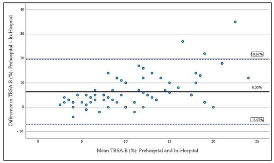 Background/Objectives: Accurate prehospital assessment of total body surface area burned (TBSA-B) is crucial for pediatric burn management, guiding resuscitation, fluid therapy, and transfer decisions. This study evaluates the accuracy of prehospital TBSA-B estimations compared to in-hospital expert assessment and examines their impact on prehospital management. Methods: This retrospective study analyzed 104 pediatric burn cases (median 17 months; 5 days–14 years) from 2017 to 2021. The primary endpoint was the difference between prehospital TBSA-B estimation and clinical measurement, with a clinically significant discrepancy defined as >5%. Secondary endpoints included the relationship between TBSA-B estimation and fluid therapy, analgesia, and hospital stay duration. Results: Prehospital TBSA-B estimations ranged from 2% to 40% (mean: 13.9%, SD = 4.4%) with scalds being the most common burn type (90.4%). Bland–Altman analysis showed a mean TBSA-B overestimation (bias) of 6.35%, with limits of agreement ranging from −6.97% (CI: −9.42 to −4.51) to 19.67% (CI: 17.21 to 22.12). No significant patterns in overestimation were associated with age, gender, or burn location. Fluid therapy volumes were independent of prehospital TBSA-B estimates, and analgesic administration varied by gender, with girls receiving less analgesia than boys, but showed no association with burn extent or severity. Hospital stay duration correlated proportionally with in-hospital assessed TBSA-B. Conclusions: Prehospital TBSA-B estimation was systematically overestimated, yet it did not influence fluid therapy decisions. Gender differences were observed in analgesic administration, while hospital stay duration was directly related to burn extent. These findings highlight the need for improved training and standardized tools to enhance prehospital burn assessment in pediatric patients.