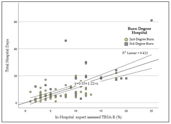 A positive linear correlation was observed between the in-hospital expert assessment of TBSA-B and the duration of hospital stay. The relationship can be expressed as: hospital stay (days) = 0.03 + 1.22 × TBSA-B (%), with a coefficient of determination (R2) of 0.422, indicating that 42.2% of the variability in treatment duration is explained by the extent of burns (Figure 2). Notably, the severity of burns did not exert an additional influence on hospital stay duration.