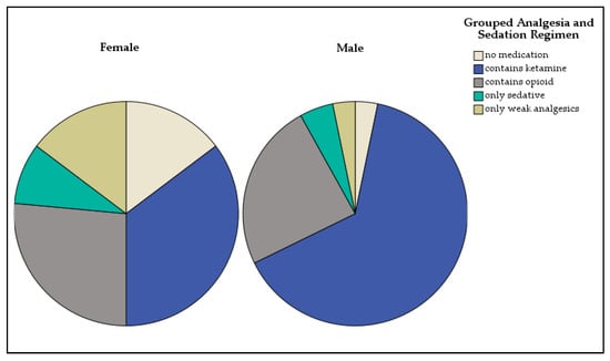Pain levels were documented in 48% of cases studied (n = 104). The median pain score was 6/10 (range: 0–9) in girls and 7/10 (range: 0–10) in boys. Analgesic administration was documented in 80% of cases studied. Ketamine combined with midazolam was the most frequently used regimen for pain management and sedation (30.2%), followed by the combination of an opioid with other substances (propofol or dimenhydrinate, 11.5%), or opioid monotherapy (10.4%). Gender-based differences were noted in the choice of analgesics even though the estimated TBSA-B was similar with a median of 12% for boys and girls. Girls were more likely than boys to receive only weak analgesics, such as Paracetamol or Ibuprofen (14.7% vs. 3.2%), sedatives alone (8.8% vs. 4.8%), or no medication at all (14.7% vs. 3.2%). Boys more frequently received ketamine-based regimens (64.5% vs. 35.3%).