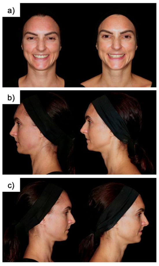 Patient photographs from different perspectives and postures before (left) and after (right) CaHA filler injection. (a) The frontal upright photograph, (b) left upright photograph, and (c) right upright photograph. These standardized clinical images illustrate the visible esthetic outcomes of calcium hydroxylapatite filler treatment at 120 days post injection. Improvements are most notable in the contour, volume, and firmness of the lower and posterior facial regions, particularly along the jawline and preauricular areas. All photographs were taken under identical lighting, positioning, and camera settings to ensure objective visual comparison.