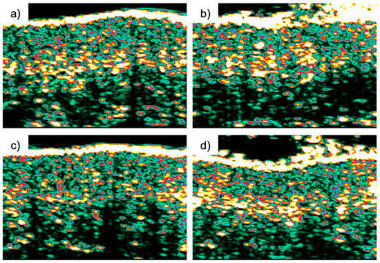 Ultrasound measurements in the tragus regions before and after filler injection assessing dermal thickness. (a) Dermal ultrasound before Rennova® Diamond Intense injection, (b) dermal ultrasound after Rennova® Diamond Intense injection, (c) dermal ultrasound before Radiesse® injection, and (d) dermal ultrasound after Radiesse® injection. The images were acquired using high-frequency ultrasonography (DermaLab® Combo-4), which captures variations in skin density and echogenicity. The brighter, more reflective upper layers correspond to the dermis, while the darker areas below represent subcutaneous tissue. Increases in dermal thickness and echogenic signal after injection indicate enhanced structural density and collagen biostimulation, as shown by the more prominent and broader bright zones in panels (b,d) compared to their respective baseline images (a,c).