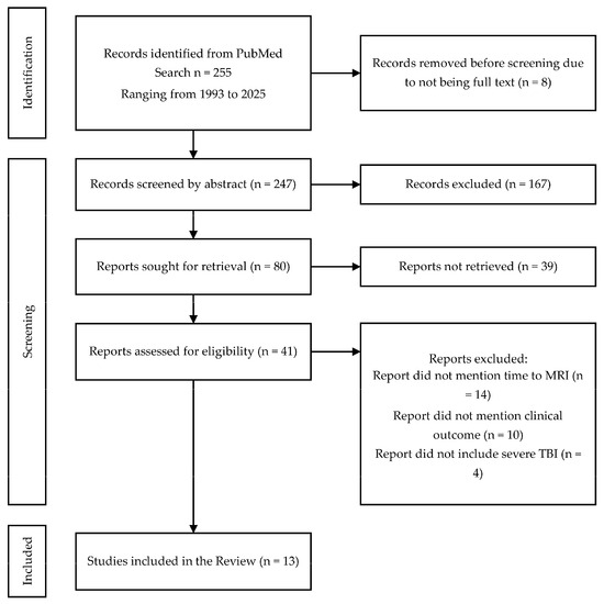 A systematic literature review was conducted with the PICO criteria using the search engine www.ncbi.nlm.nih.gov. The search terms used were ((“magnetic resonance imaging”[MeSH] OR “MRI”[tiab] OR “magnetic resonance”[tiab]) AND (“traumatic brain injury”[MeSH] OR “TBI”[tiab] OR “brain trauma”[tiab] OR “head injury”[tiab]) AND (“timing”[tiab] OR “early”[tiab] OR “delayed”[tiab] OR “acute”[tiab] OR “subacute”[tiab]) AND (“moderate”[tiab] OR “severe”[tiab]) AND (“prognosis”[MeSH] OR “outcome”[tiab] OR “predict*”[tiab])). From the search, 255 relevant scientific works from 1993 to 2025 were identified and 13 were deemed relevant (Figure 1). In addition, based on this review, the data regarding MRI timing at our department were analyzed over a period of 2 years. Between January 2023 and January 2025, 15 ventilated patients with severe TBI and who had MRI conducted were identified at our department. The grade of TBI, length of hospital stay, and timing of the first cranial MRI were recorded. The following inclusion criteria for the selected articles were chosen according to the PICO criteria: adult and pediatric patients with moderate and severe TBI, MRI performed at any time point post-injury with timing information reported, different MRI timing groups and CT imaging, prognostic value, prospective and retrospective study designs, and randomized controlled and cohort studies with a minimum of 10 patients.