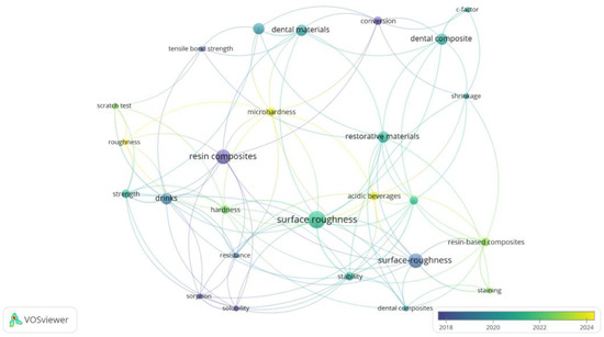 To situate the current study within ongoing research trends, a bibliometric analysis was performed using VOSviewer software (version 1.6.20). The co-occurrence map in Figure 1 was generated from keywords in the recent literature on resin-based dental composites and degradation processes. The color scale reflects the average publication year, with newer topics shown in yellow and more established ones in blue–green, providing a dynamic view of thematic evolution from 2018 to 2024.
