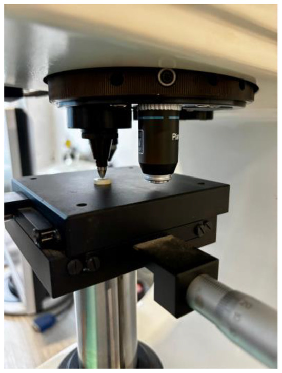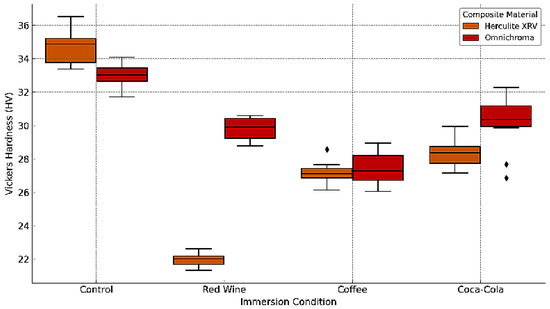 The matrices of resin-based composites are susceptible to chemical interactions with dietary components and organic acids. Clinical exposure to such agents—via food, beverages, and saliva—can significantly affect surface hardness and roughness, accelerating the degradation and aging of restorations [10]. Previous studies by our research group have already addressed related mechanical and surface properties of the same composite materials—such as surface roughness, color stability, and morphological changes—using profilometry, scanning electron microscopy (SEM), and energy-dispersive X-ray spectroscopy (EDS) [11,12]. Hardness is one of the most critical properties of restorative materials, reflecting a surface’s resistance to penetration or deformation. It serves as a reliable indicator of various other properties, such as compressive strength, proportional limit, and ductility. International standards organizations have recognized the importance of hardness and included it in the specifications for dental materials [13].