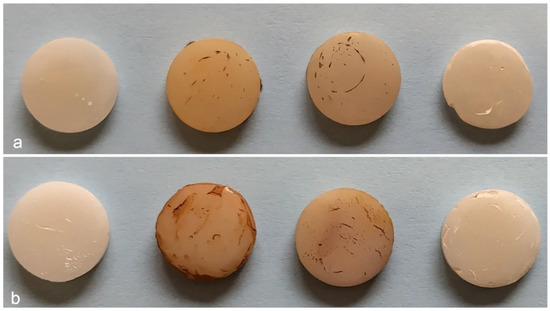 Macrophotographic analysis of resin composite specimens after 10-day beverage immersion. (a) Omnichroma specimens; (b) Herculite XRV specimens. From left to right in each row: control, coffee, red wine, and Coca-Cola.