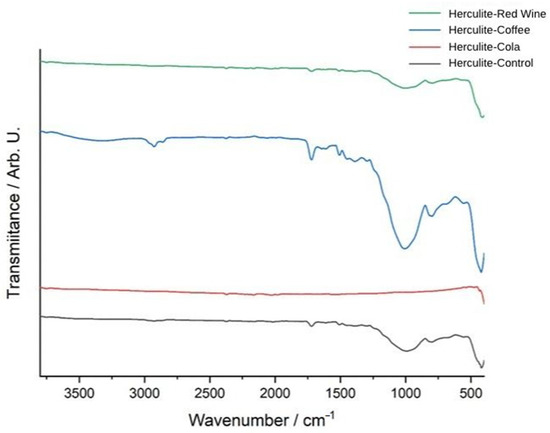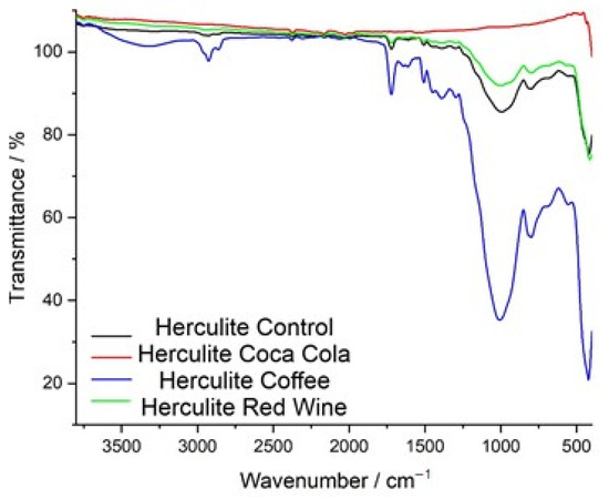 FTIR spectra of Herculite resin: control and post-immersion in coffee, red wine, and Coca-Cola.