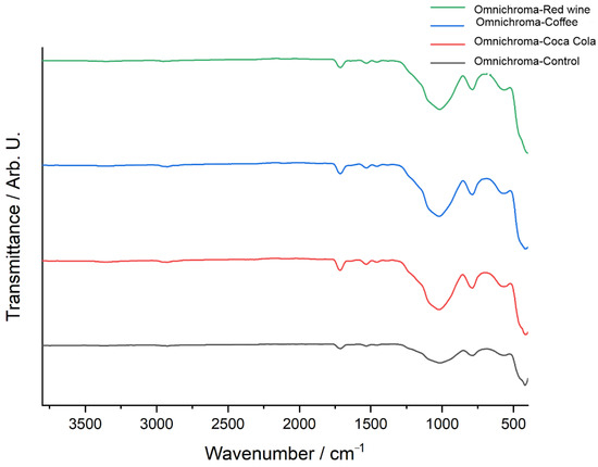 FTIR spectra of Omnichroma: control vs. immersion in coffee, red wine, and Coca-Cola.
