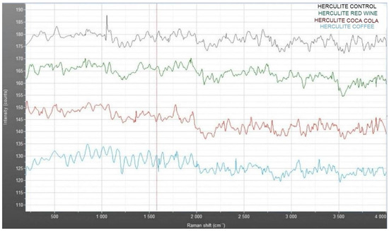 The Raman spectra in Figure 10 compare the vibrational characteristics of Herculite composite resin under different conditions: control (blue), red wine immersion (green), Coca-Cola immersion (red), and coffee immersion (light blue). The control sample exhibits distinct and stable intensity peaks across the Raman shift range, serving as a baseline for structural integrity. In contrast, the spectra for samples exposed to red wine, Coca-Cola, and coffee reveal noticeable intensity reductions and variations in peak positions, particularly in the 500–1500 cm−1 region. These shifts suggest alterations in the chemical structure and bonding within the resin matrix due to interaction with the staining solutions. Among the immersed samples, the red wine-treated specimen (green) displays moderate changes, while Coca-Cola (red) shows less pronounced deviations compared to coffee (light blue), which exhibits the most significant decrease in intensity, indicating potential degradation or structural modification.