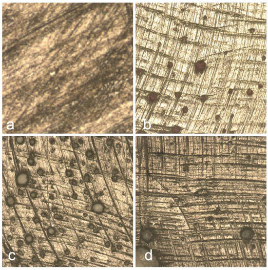 Figure 11 displays the surface morphology of the Herculite composite resin after immersion in various beverages, highlighting the topographical changes induced by each solution. Image (a) shows the surface after coffee exposure, where irregular striations and darkened regions suggest surface roughening and pigment penetration. In (b), red wine-treated samples reveal scattered dark deposits, likely due to polyphenolic compounds adhering to the surface. Image (c), representing Coca-Cola exposure, presents numerous rounded micro-defects possibly associated with acidic erosion. The control sample (d) maintains a relatively uniform texture, with minimal surface disruptions, serving as a reference for untreated composite integrity.