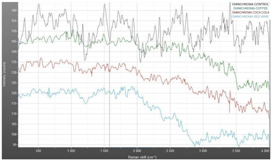 Raman spectra of Omnichroma: comparative analysis of control and samples immersed in coffee, Coca-Cola, and red wine.