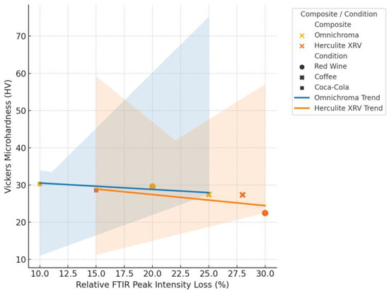 To further explore the relationship between molecular and mechanical changes in resin composites, a correlation analysis was performed between the relative loss of FTIR peak intensity and the percentage reduction in Vickers microhardness following beverage exposure. In this expanded analysis (Figure 15), data were disaggregated by material type—Omnichroma and Herculite XRV—to assess whether degradation mechanisms varied across composite formulations. The resulting scatterplot shows two distinct linear trends, one for each composite. In both cases, greater spectroscopic alterations were associated with more substantial surface hardness loss, confirming that beverage-induced chemical degradation—particularly involving ester and siloxane functional groups—can compromise filler–matrix stability. Notably, Herculite XRV exhibited a slightly stronger correlation, suggesting a more predictable mechanical response to molecular changes, while Omnichroma showed a more dispersed pattern, potentially due to its suprananospherical filler technology.